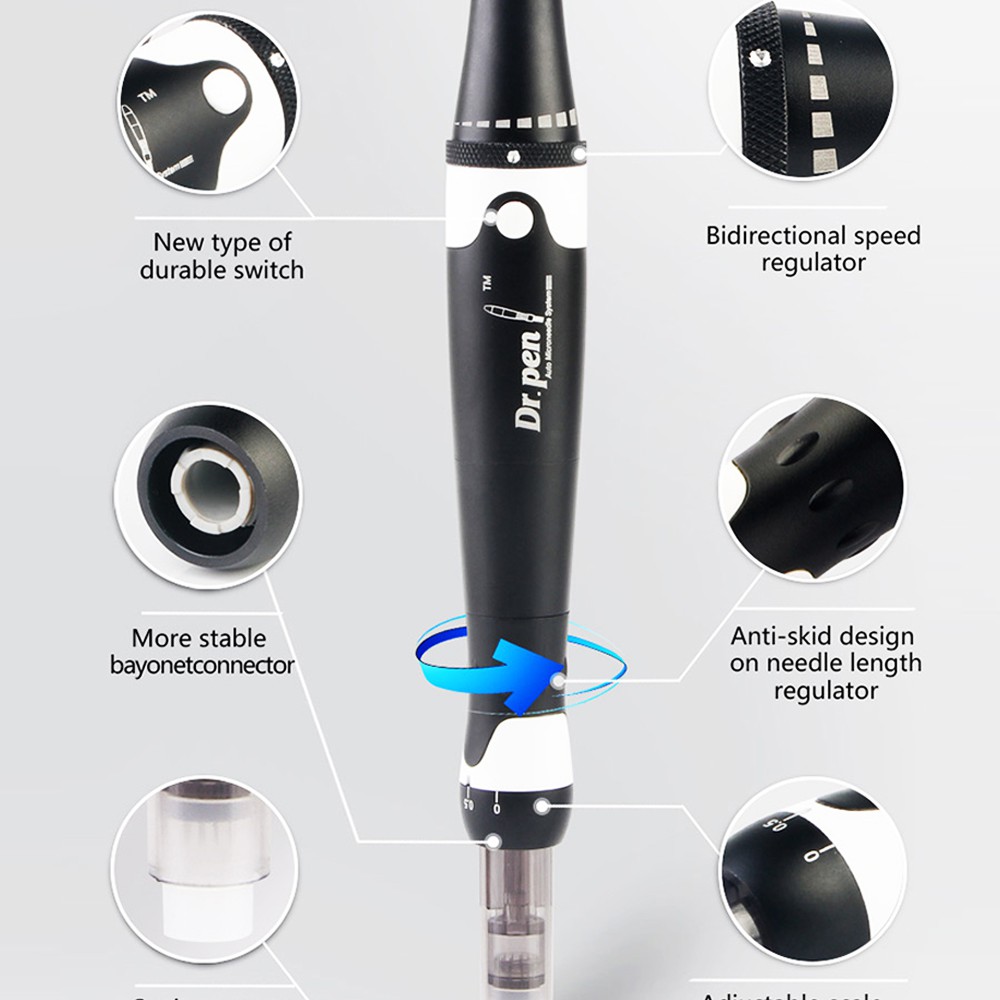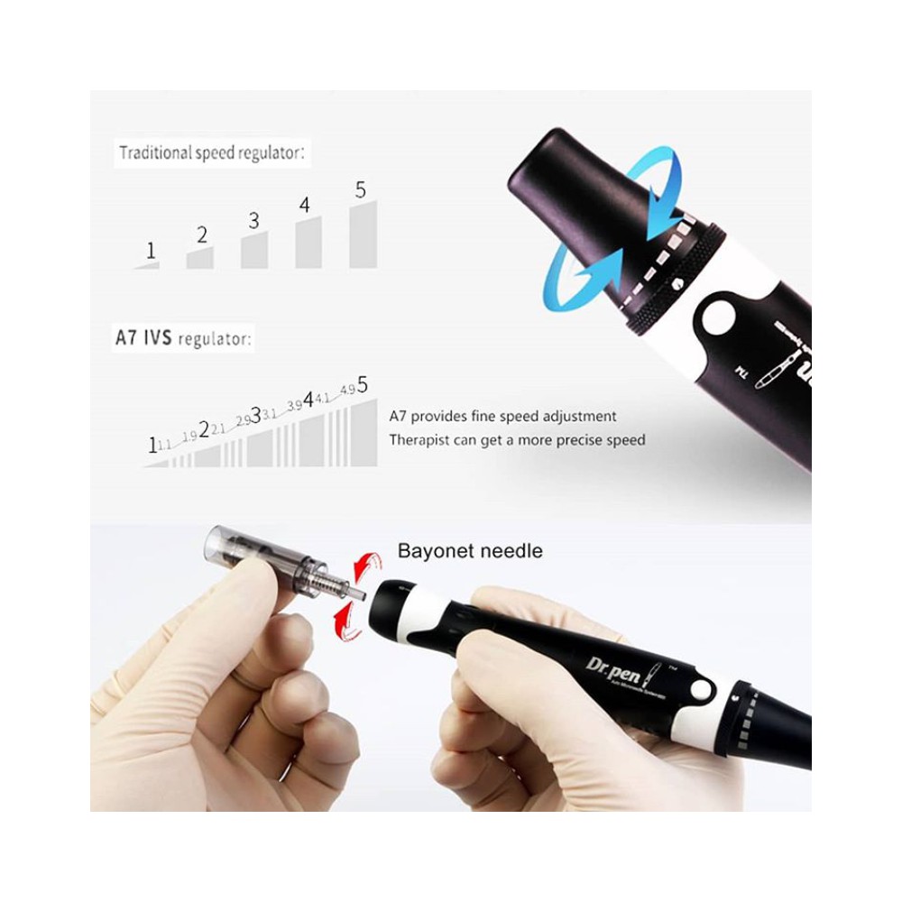میکرونیدلینگ دکتر پن مدل A7 با طراحی آرگونومیک بسیار زیبا و سبک طراحی شده است. میکرونیدلینگ دکتر پن دارای 2 عدد سری است که با متصل نمودن نیدل هایی از جنس تیتانیوم با اندازه هایی از 0.25 میلی متر تا 2 میلی متر مورد استفاده قرار می گیرد.میکرونیدلینگ مدل A7 قابلیت تنظیم سرعت در 5 سطح را دارد و سرعت ضربه این دستگاه از تا 20.000 دور در دقیقه می باشد.